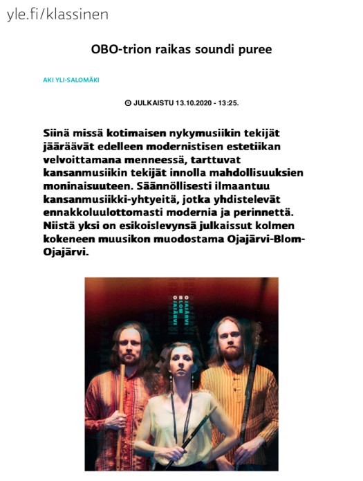 Ojajärvi Blom Ojajärvi (OBO) on ensimmäinen suomalaisen yläsävelhuilun, pitkähuilun ympärille rakentuva moderni yhtye. Tuoreen trion kappaleissa yhdistyvät pohjoismainen yläsävelhuilu (pitkähuilu), beatbox ja cittern ennenkuulumattomalla tavalla. Yhtyeen musiikki kumpuaa yläsävelhuilujen kiehtovasta viremaailmasta ja sen inspiroimasta tajunnanvirrasta. Perinnemelodiat ja yläsävelhuilulle sävelletyt tuoreet kappaleet mukautuvat luonnonsävelasteikon lumoavaan tanssiin. Yhtye karistelee pölyt muinaisen suomalaisen yläsävelhuilun, pitkähuilun, harteilta. Trion soinnissa yhdistyvät muinainen luonnonsävelsarjaan pohjautuva yläsävelhuilun melodiikka, citternin folkrock-vaikutteinen riffittely, sekä iskevä beatboxaus.