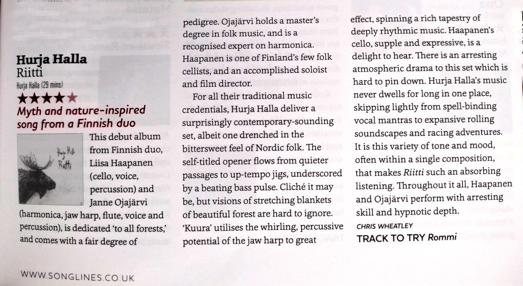 ”It is this variety of tone and mood, often within a single composition, that makes Riitti such an absorbing listening” (Songlines Magazine UK, June 2022 issue, 4/5 stars review.